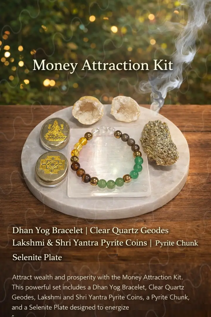A sacred Money Attraction Kit combining pyrite, quartz, selenite, and a Dhan Yog bracelet to activate wealth energy, remove financial blockages, and invite prosperity and abundance into daily life with high-energy crystals to align your vibration with wealth and prosperity.